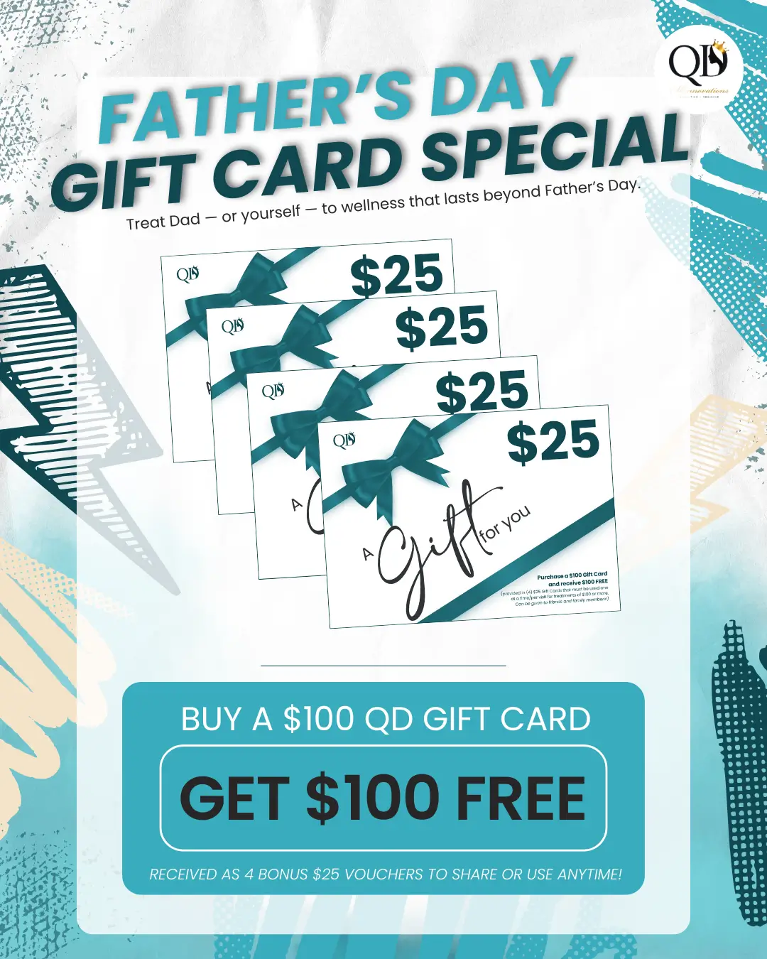 Buy a $100 QD Gift Card and get $100 FREE in bonus vouchers (4 x $25). Give Dad a gift that lasts beyond Father’s Day—or treat yourself too!